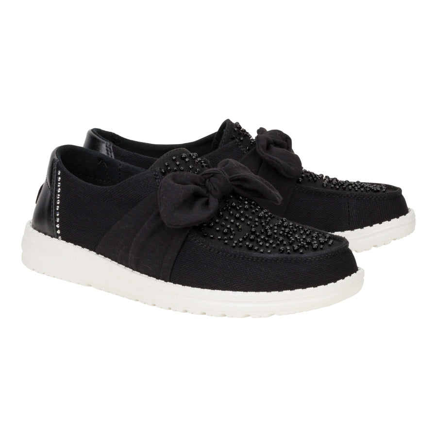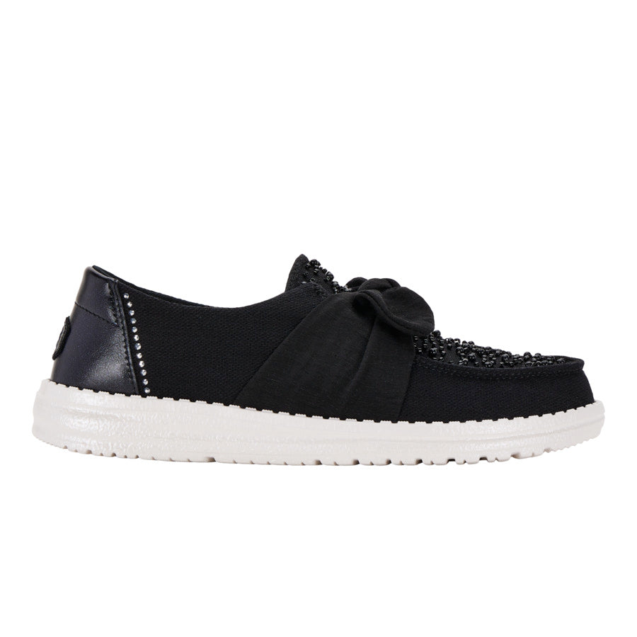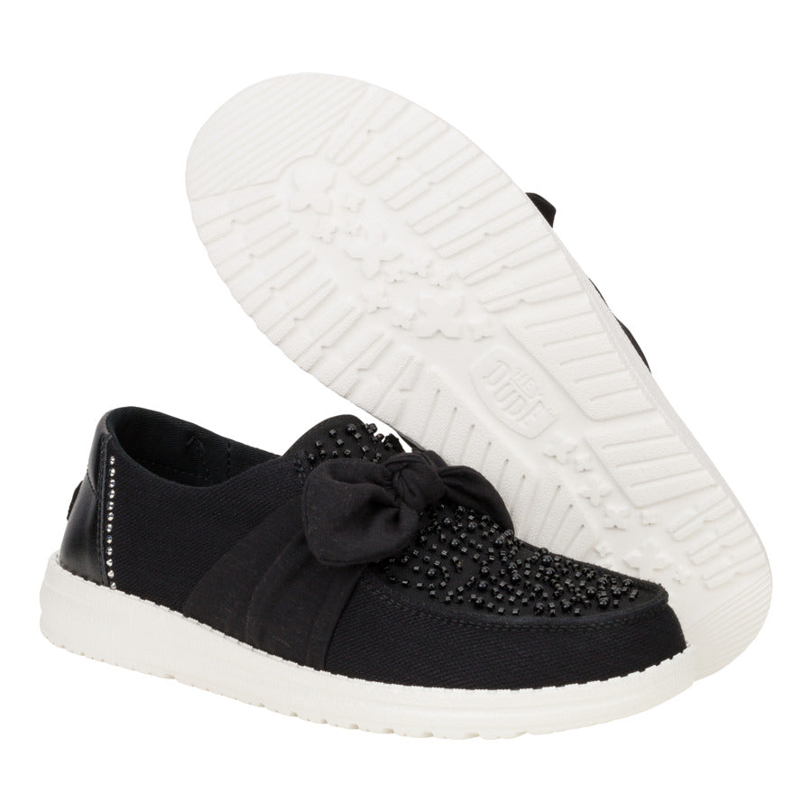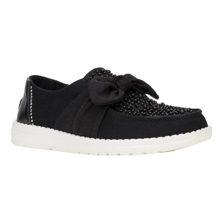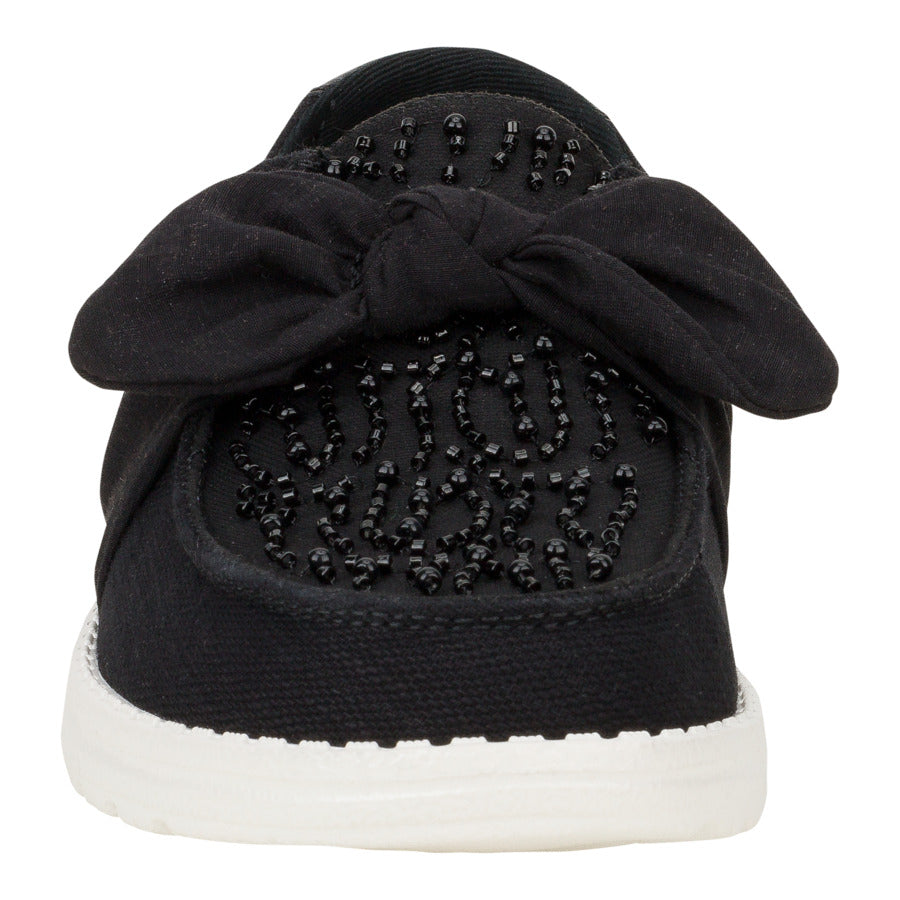 Enter: Wendy Bow Embellishment. This showstopper features a whimsical fixed bow and dazzling beaded details, all atop a light-as-air organza upper. Rhinestones on the heel for an extra twinkle, making them perfect for turning heads at your next special occasion. And the best part? Our easy-on system and a cushy, removable foam insole ensure comfort, so you can dance the night away.